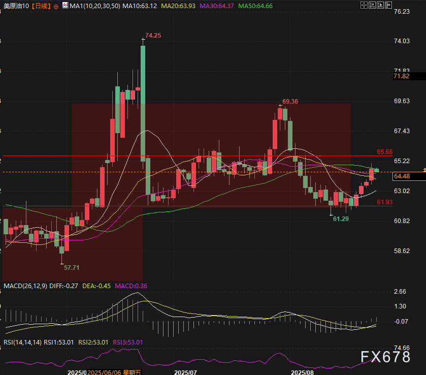 美原油10月期货合约继续在箱体中运行,第一压力位在65.66,箱体的50%分位置,目前20、30、50日均线空头排列,MACD零轴以下金叉,等待向零轴突破,预示油价这里或震荡整理,等待均线和指标修复,最近支撑位在30日均线的64.37,之后是64.19为周一日线的突破位置。