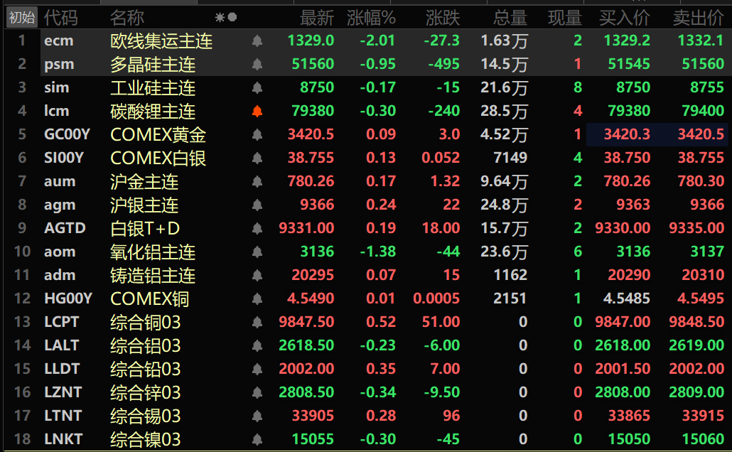 此外,铸造铝主连期货涨0.07%,氧化铝主连跌1.38%。碳酸锂主连跌0.3%,工业硅主连跌0.17%。多晶硅主连跌0.95%。