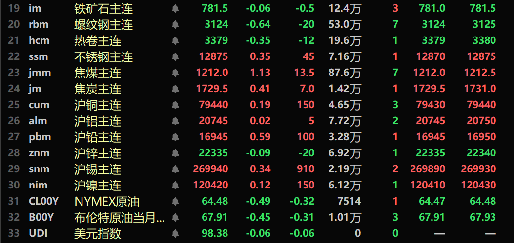 黑色系涨跌参半,铁矿微跌%,螺纹跌0.64%,热卷跌0.35%。不锈钢涨0.35%。双焦方面:焦煤主力合约涨1.13%,焦炭主力合约涨0.41%。