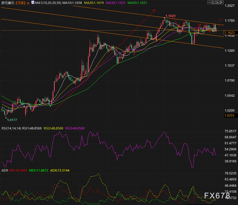 近几周,欧元兑美元继续构筑看涨旗形,阻力位与支撑位分别为1.1819和1.1500。目前价格尚未形成突破该区间的有效动能,短期中性格局仍将主导市场。相对强弱指数(RSI):始终在中性50关口附近震荡,表明多空力量仍处于均衡态势,短期横盘格局延续概率较高。平均趋向指数(ADX):始终维持在20下方,表明市场整体波动率维持低位,进一步印证短期中性偏向的持续性。
