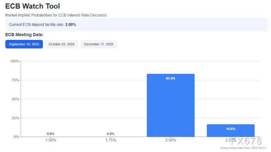 市场预期与欧央行中性立场高度一致:概率模型显示,9月10日下次议息会议上,存款利率维持2.00%的概率高达83.4%,短期内中性政策框架将进一步巩固。