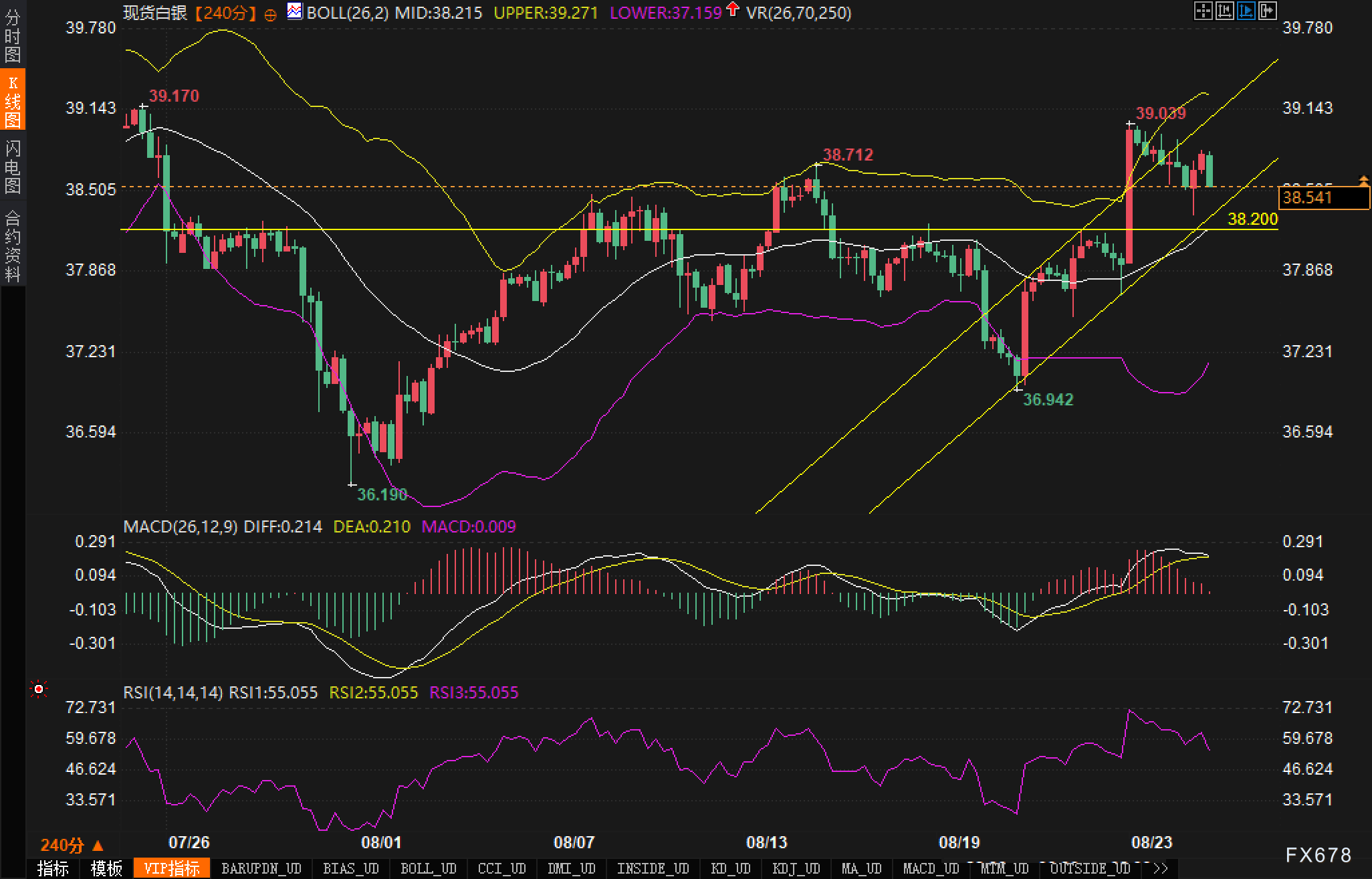 4小时K线显示,白银沿上升通道运行,前高39.039未能有效延伸,但回撤在通道下沿获支撑后迅速企稳,短线进入高位整理。布林带显示,上轨39.271、中轨38.215、下轨37.159,价格近期多次在上轨—中轨之间切换,体现布林带宽呈温和扩张的“趋势+震荡”混合阶段;图中38.40附近为关键价区,叠加38.200的水平支撑线,构成当下最重要的双重支撑带。