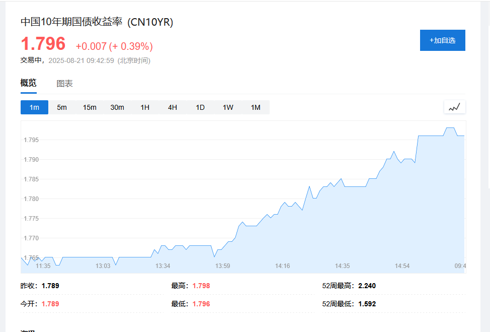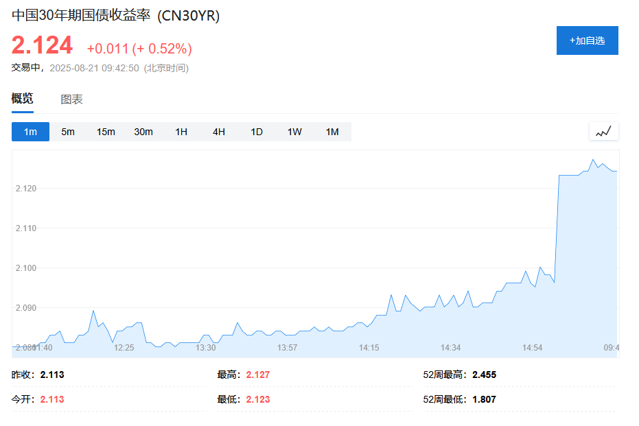 21日早间,中国30年期国债活跃券2500002收益率一度上行1bp至2.0525%,对比中债估值为去年12月来新高;10年期国债收益率升近1个基点至1.7875%,对比中债估值来到4月初高位。