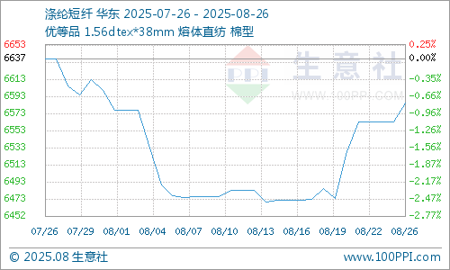 据生意社商品行情分析系统,近期国内涤纶短纤价格震荡上行,截止8月26日国内涤纶短纤(1.4D*38mm)市场均价在6585元/吨,较8月20日上涨1.73%。