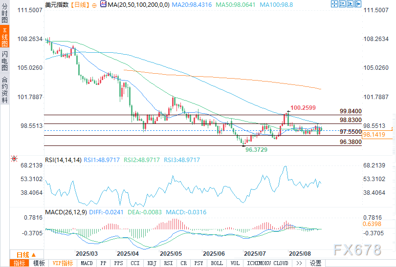 从技术面来看,美元指数目前在50日均线(98.10)上方盘整,但整体处于97.56支撑位与98.83阻力位之间的窄幅区间内。本月早些时候,多头曾短暂突破100.25,但未能守住这一水平;此后,美元指数始终难以重新站上99.32,更遑论测试99.84的长期阻力位。