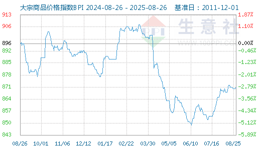 8月26日大宗商品价格指数BPI为871点,与昨日持平,较周期内最高点1343点(2021-10-19)下降了