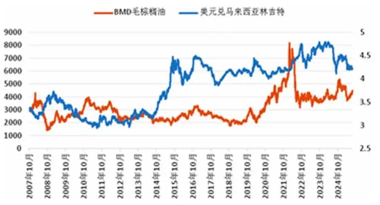 图2:BMD毛棕榈油主力收盘价及美元兑林吉特汇率(林吉特/吨)
