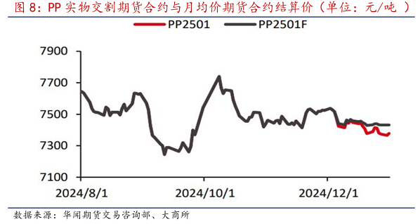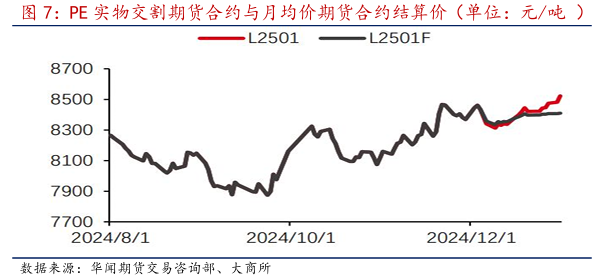 以L2501F合约为例,自挂牌起至2024年11月底,每个交易日的当日结算价锚定L2501合约的当日结算价,例如11月25日L2501结算价为8395元/吨,那么L2501F结算价为8395元/吨,等于实物交割合约结算价。