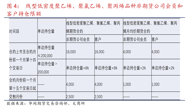 大商所对月均价期货与实物交割期货分开设置持仓限额,月均价期货和实物交割期货的总持仓限额不超过现有品种持仓限额,月均价期货持仓限额为现有品种持仓限额的 1/5,实物交割期货持仓限额为现有品种的 4/5,确保持仓限额总水平不扩大。