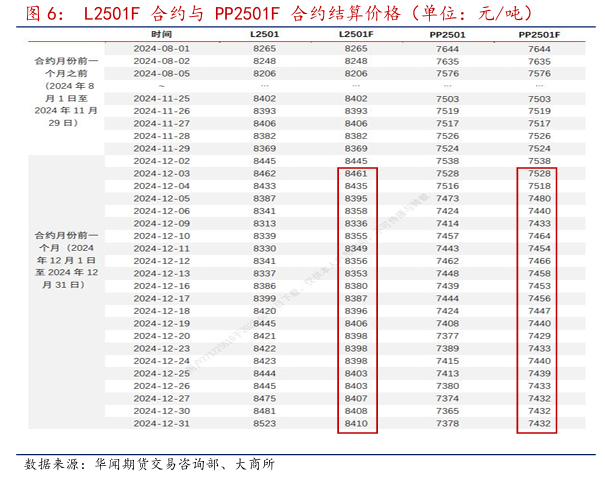 按照月均价期货合约结算价计算公式可得L2501F合约与PP2501F合约挂牌六个月内的每日结算价见下表所示。
