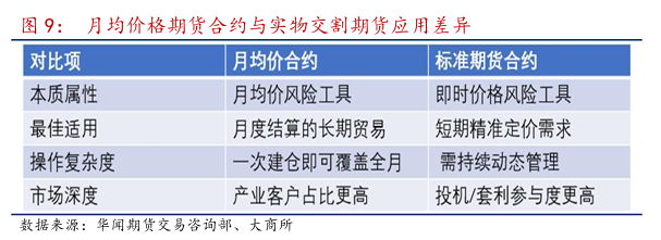 月均价格合约特别适合长期稳定采购/销售、采用"月度定价"模式的产业客户,是传统期货合约的重要补充。在应用上与实物交割的标准期货合约有以下几点核心差异。