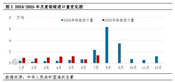 【导语】2025年7月国内铅锭(粗铅+精铅)进口量1.345万吨,环比增加106.70%。7月内外价差延续震荡走势,进口空间仍未打开,不过粗铅进口量小幅回升。8月沪伦比值维持震荡,但重心环比小升,预计进口量或小幅增加。
