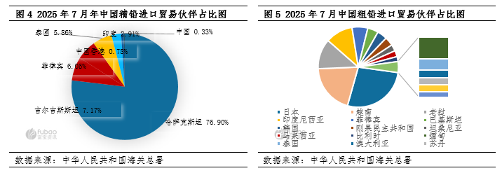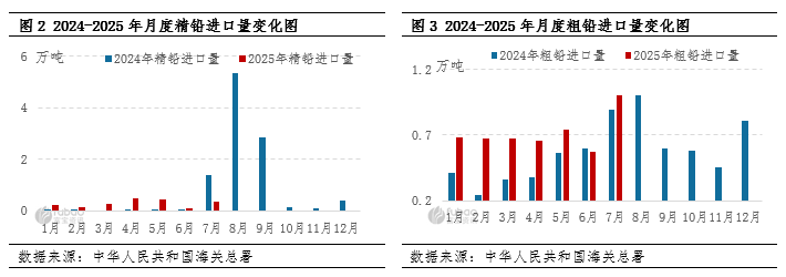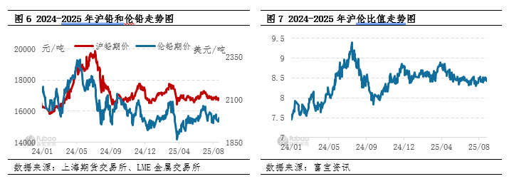 2025年7月内外价差延续震荡走势,进口空间仍未打开。7月国内期铅主力震荡下跌,本月累计下跌2.70%,伦铅先跌后涨,本月累计下跌3.53%,沪伦比值呈现区间震荡走势,均值重心较6月回落约0.37%,当前内外价差不利于进口,虽然本月整体进口量随较上月回升,但整体增量有限。8月来看,沪伦比值仍在8.4-8.6区间内波动,不过重心较7月有所回升,预计8月进口量或小幅增加。