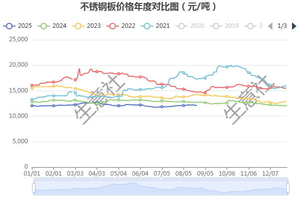 据生意社价格监测,8月不锈钢价格先涨后跌。截止8月末,不锈钢现货价格12085.71元/吨,较月初的12092.86元/吨下跌0.06%,同比下跌5.05%。