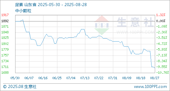 8月28日,生意社尿素基准价为1707.50元/吨,与本月初(1812.50元/吨)相比,下降了5.79%。