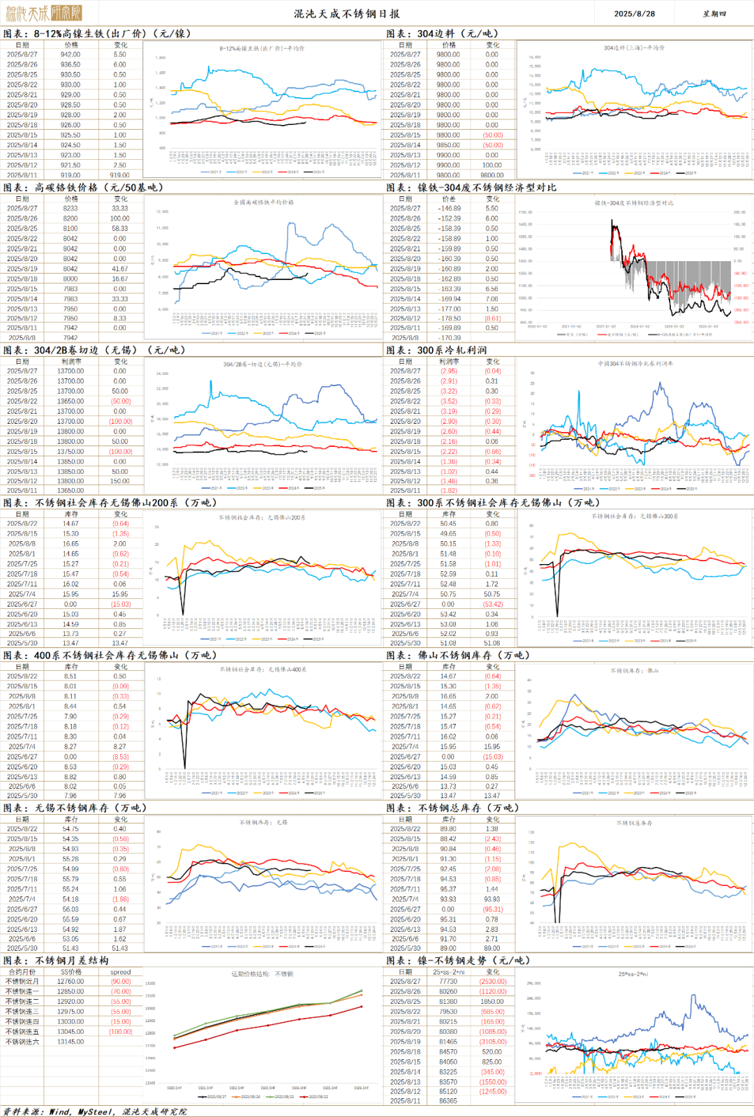 昨日不锈钢主力合约收盘价12850元/吨,涨跌幅-0.02%。无锡现货基差升水-5至535元/吨;主力合约持仓-5255至128304手;仓单-175至100851吨。