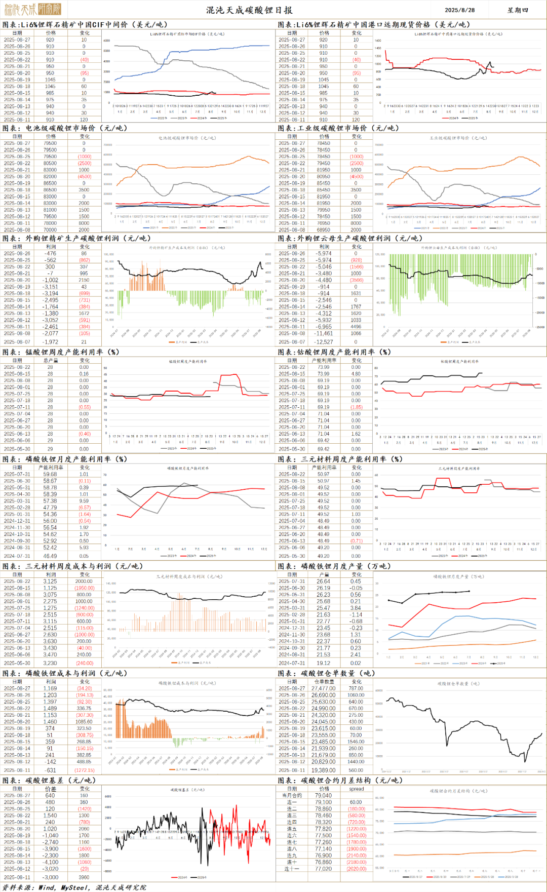昨日碳酸锂主力合约收盘价78860元/吨,涨幅-0.23%。主力合约持仓+1826至351322手,仓单+787至27477吨。现货方面,电池级碳酸锂报价维持79500元/吨,工业级碳酸锂报价维持78450元/吨。锂精矿均价维持920美元/吨。