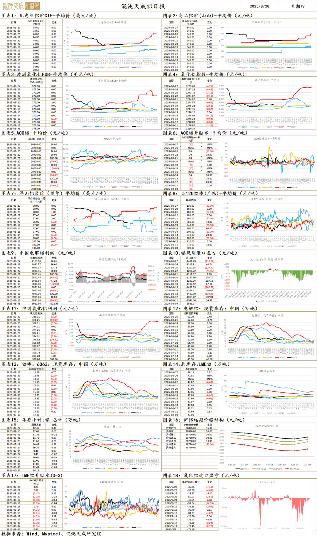 整体来看,鲍威尔表态偏鸽,特朗普计划裁撤美联储理事,美联储9月降息预期升温。现实需求走弱致电解铝7月后趋势累库,铝价偏强震荡运行,关注美联储降息预期及国内反内卷政策。7月进口铝土矿同比增34%,国内铝土矿库存高位,原料供应宽松,冶炼利润仍存下,周产量持续高位,库存持续累库,基本面仍偏空,逢高可轻仓试空,上边际为3500(反内卷政策出清预期打到的前期高点),出场信号可关注现货价格是否击穿高边际成本。