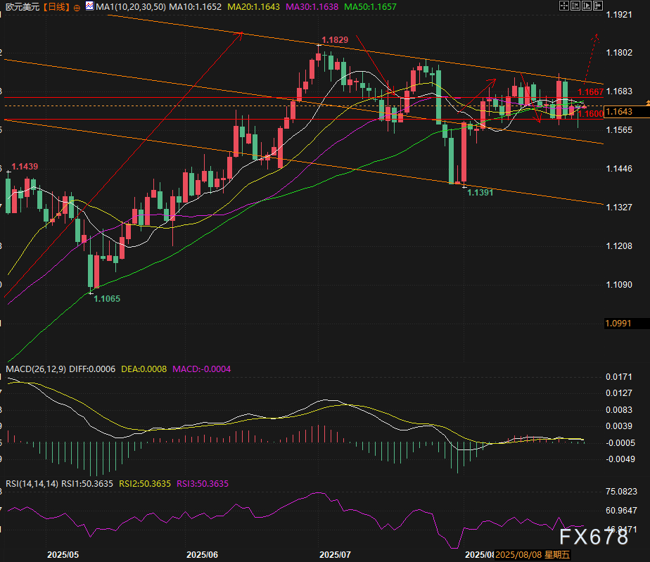 形态层面,当前呈现“看涨旗形”整理形态,形态上沿位于1.1720附近——若收于1.1740上方,将确认该形态突破,理论上行目标指向1.2120(突破点1.1740叠加380点量幅),即汇价有望站上1.2000关口。除1.1600外,下方关键支撑依次为1.1527(前期整理平台下沿)及1.1450(近期重要低点,若失守将确认短期多头结构终结)。