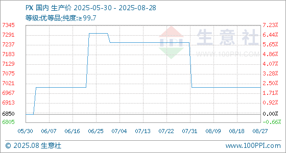 8月28日,生意社PX基准价为7000.00元/吨,与本月初(7250.00元/吨)相比,下降了3.45%。