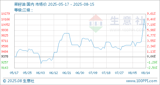8月15日生意社菜籽油基准价为9956.67元/吨