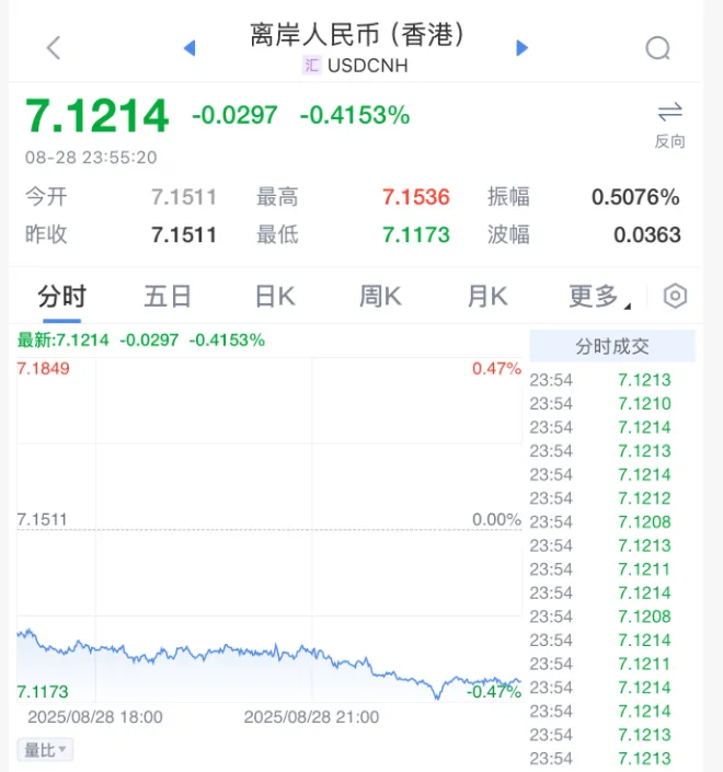 28日晚间,离岸人民币对美元汇率大涨约300个基点,一度涨至7.1173,为2024年11月6日以来首次突破7.12关口。值得注意的是,人民币升值的幅度远超美元贬值幅度。