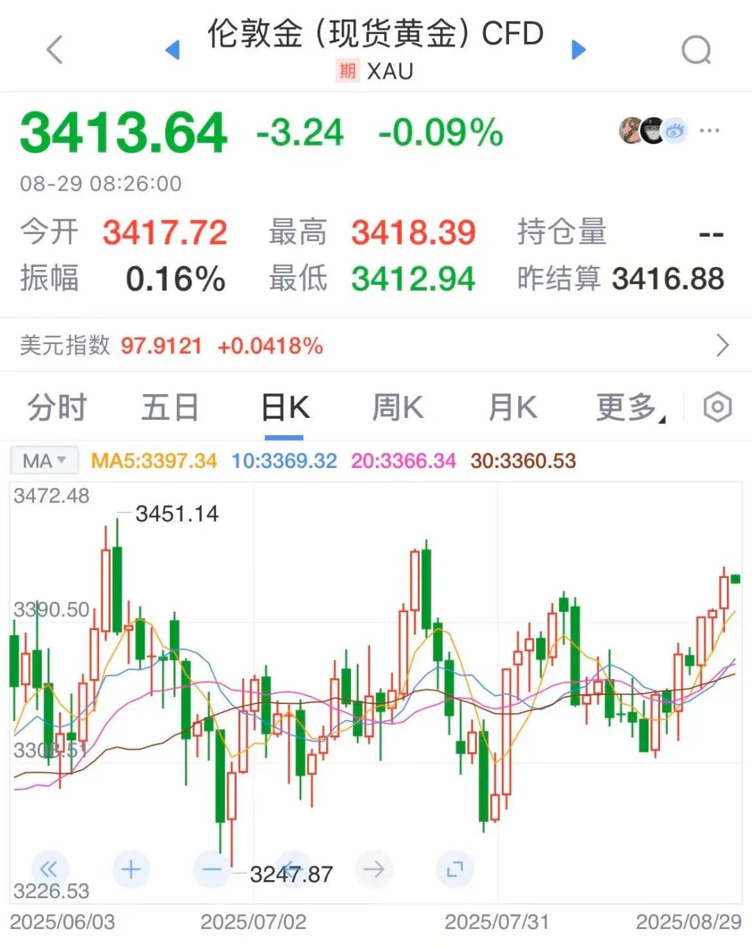 截至发稿时,美元指数和美债收益率走低,伦敦现货金价3413.6美元/盎司。美国银行(Bank of America)分析师预计,国际金价有望继续上涨,至2026年上半年,国际金价或将触及4000美元/盎司。