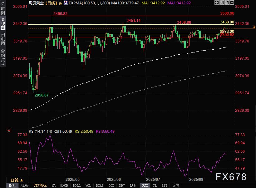 现货黄金日内虽处跌势,但贵金属长期看涨基调未改。日线图显示价格坚守在100日指数移动平均线(EMA)(3279.45)这一关键技术位上方。14日相对强弱指数(RSI)稳居中线上方处60.50附近,印证近期看涨动能延续。