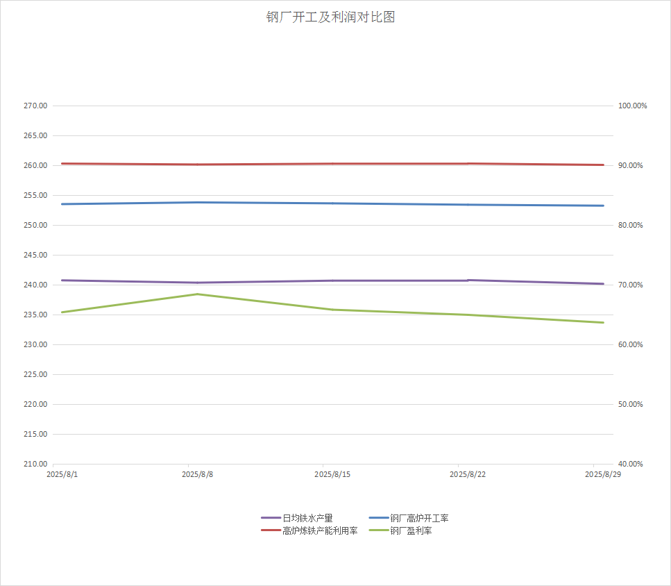 需求方面,8月钢厂高炉开工整体情况保持高位稳定,主要在于钢厂利润维持稳定,生产积极性较好,铁水产量维持高位。8月由于下游终端开工受限情况较多,钢材释放乏力。短期内钢厂利润尚可支撑现有生产规模。9月起,各地气温开始下降,终端开工情况会逐步好转,利好铁水需求,但具体增加情况还要看钢厂利润情况以及下游钢材成交情况,9月初铁矿需求或小幅增长。