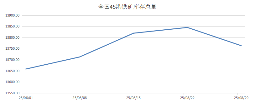 库存方面,截至8月29日,全国45个港口进口铁矿库存为13763.02万吨,周环比减少82.18万吨,月环比增加105.12万吨;日均疏港量为318.64万吨,周环比减少7.1万吨,月环比增加15.93吨;在港船舶数101条,与7月底相比增加5条。上周铁矿港口库存情况如上图;全国钢厂进口铁矿库存总量为9007.19万吨,月环比减少4.9万吨。8月以来钢厂利润情况维持良好,开工积极性较好,使得钢厂提货需求持续增加,所以日疏港量月环比增长。钢厂利润情况向好下开工积极性较好,钢厂厂内库存不断消耗,但8月以来海外发运恢复,港口库存开始止降增长。现阶段钢铁后续行情还是要看下游钢材成交情况,如果9月钢材市场仍能有所增长,钢厂铁矿需求释放韧性可期,铁矿港口库存有继续去库可能。