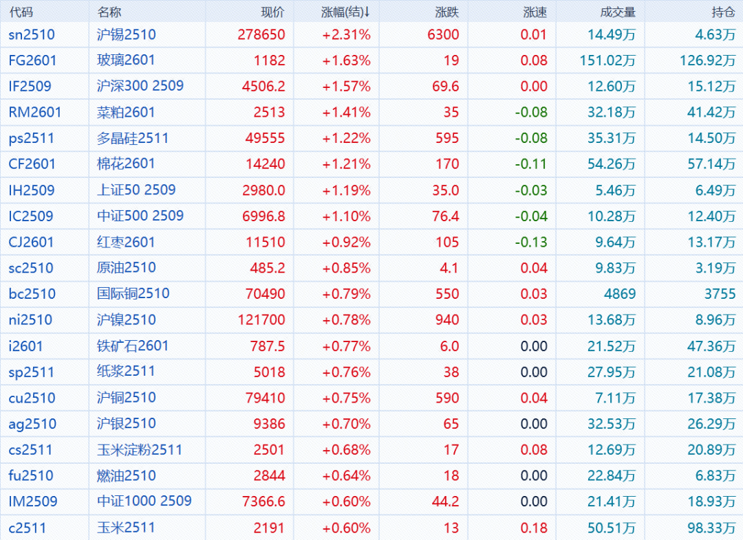 沪深300股指期货(IF)主力合约涨1.56%,上证50股指期货(IH)主力合约涨1.19%,中证500股指期货(IC)主力合约涨1.10%,中证1000股指期货(IM)主力合约涨0.56%。