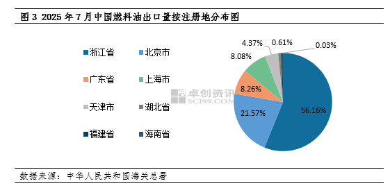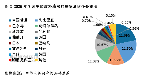 一方面,2025年7月份中国燃料油产量下降,国家统计局数据显示,7月份中国燃料油产量332.6万吨,环比减少30.2万吨。另一方面,7月份国际干散货航运运价震荡上涨,运价中枢上移。从反映干散货综合运价水平的BDI指数来看,7月份均值为1819点,环比上涨7.95%。虽然国际干散货航运市场整体表现尚可,但国际航运市场的需求存在阶段性波动。另外燃料油作为替代性原料需求增加,也在一定程度上抑制出口意愿。海关数据显示,2025年7月中国燃料油出口量145.41万吨,环比下降37.28%,同比下降21.12%;2025年1-7月中国燃料油累计出口量1153.56万吨,同比下降1.37%。