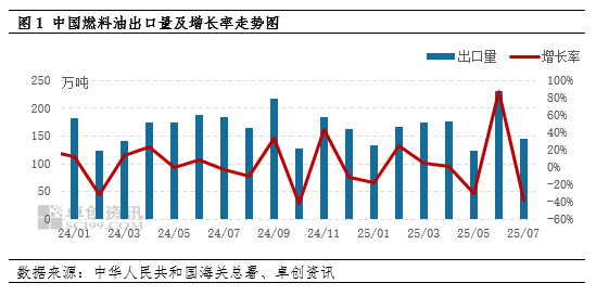 在国内燃料油供应量下降以及航运需求阶段性放缓的影响下,7月中国燃料油出口量下降。海关数据显示,2025年7月中国燃料油出口量145.41万吨,环比减少86.4万吨或37.28%。