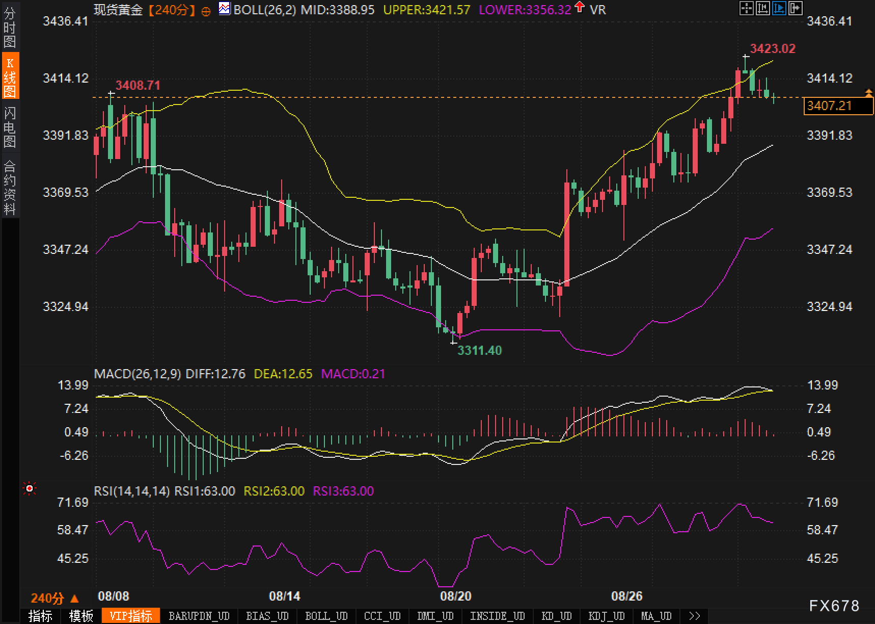 ——阻力:3415(短线枢轴)、3421.57(布林上轨)、3423.02(阶段高点)。