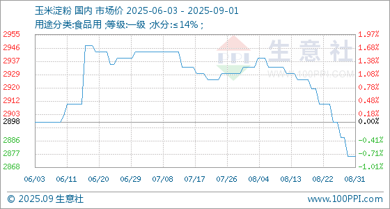 9月1日生意社玉米淀粉基准价为2876.00元/吨