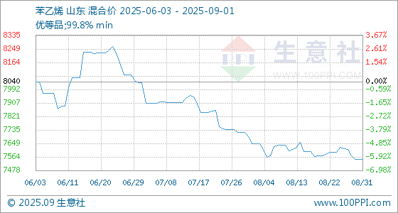 9月1日,生意社苯乙烯基准价为7550.00元/吨,与上月初(7694.00元/吨)相比,下降了1.87%。