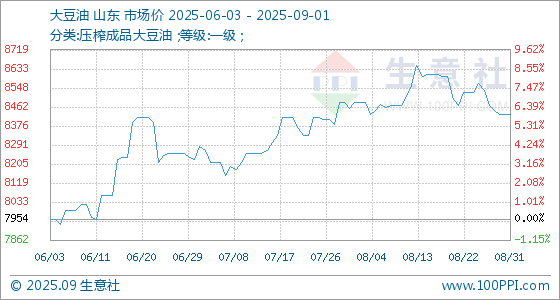 9月1日,生意社大豆油基准价为8428.00元/吨,与上月初(8454.00元/吨)相比,下降了0.31%。