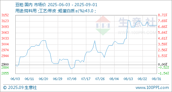 9月1日,生意社豆粕基准价为3102.00元/吨,与上月初(2984.00元/吨)相比,上涨了3.95%。