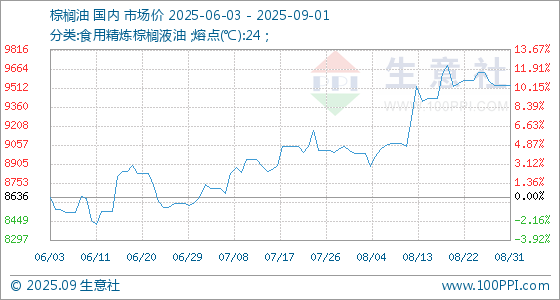 9月1日,生意社棕榈油基准价为9532.00元/吨,与上月初(9012.00元/吨)相比,上涨了5.77%。