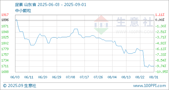 9月1日,生意社尿素基准价为1712.50元/吨,与上月初(1812.50元/吨)相比,下降了5.52%。