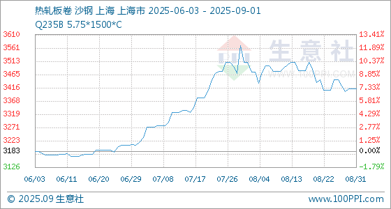 9月1日,生意社热轧板卷基准价为3413.33元/吨,与上月初(3510.00元/吨)相比,下降了2.75%。
