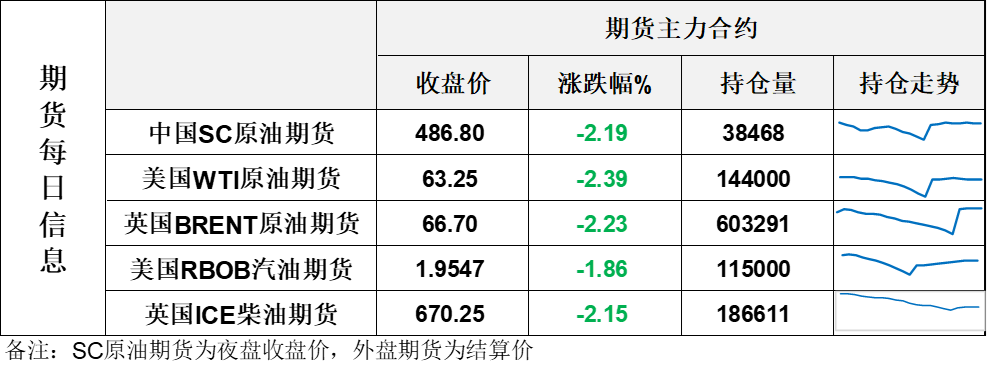 【1】WTI主力原油期货收跌1.55美元,跌幅2.39%,报63.25美元/桶;布伦特主力原油期货收跌1.52美元,跌幅2.23%,报66.7美元/桶;INE原油期货收跌2.19%,报486.8元。