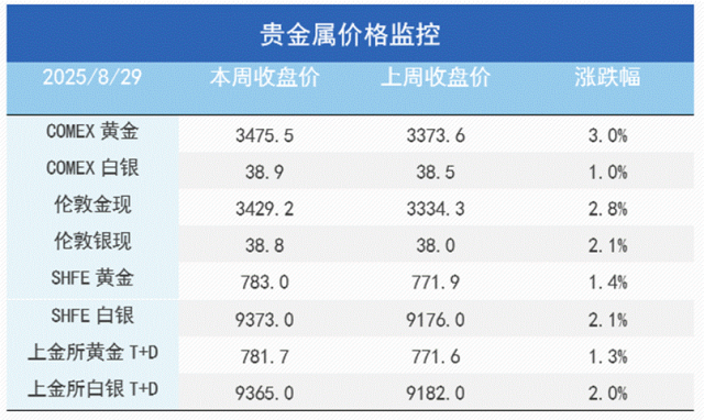 贵金属价格上周显著反弹,COMEX金银于3396-3519美元/盎司、38.6-40.9美元/盎司区间内运行。上周,特朗普威胁对俄“经济战”,而周末伊以的冲突似有升级,同时特朗普罢免美联储理事库克,联储独立性再度遭受质疑,而美国核心PCE数据符合预期,市场依然交易9月联储的降息,由此,避险情绪叠加降息预期下,金银价格大幅走强。
