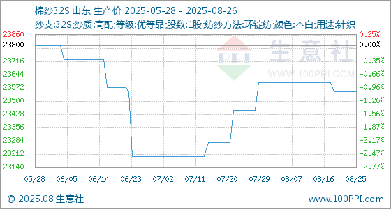 8月26日,生意社棉纱32S基准价为23550.00元/吨,与本月初(23600.00元/吨)相比,下降了0.21%。