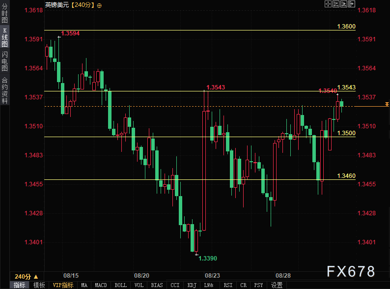 上行方面,汇价坚守在1.3500支撑之上,并成功突破8月22日高点(1.3543)阻力位。若如此,下一个目标将直接指向1.3600整数关口,突破后可能打开更大的上行空间。