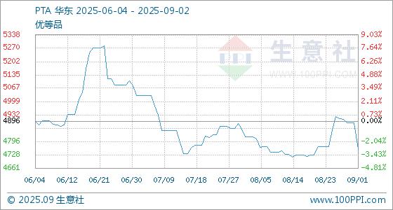 9月2日,生意社PTA基准价为4755.50元/吨,与本月初(4891.25元/吨)相比,下降了2.78%。