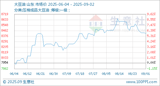 9月2日,生意社大豆油基准价为8420.00元/吨,与本月初(8428.00元/吨)相比,下降了0.09%。