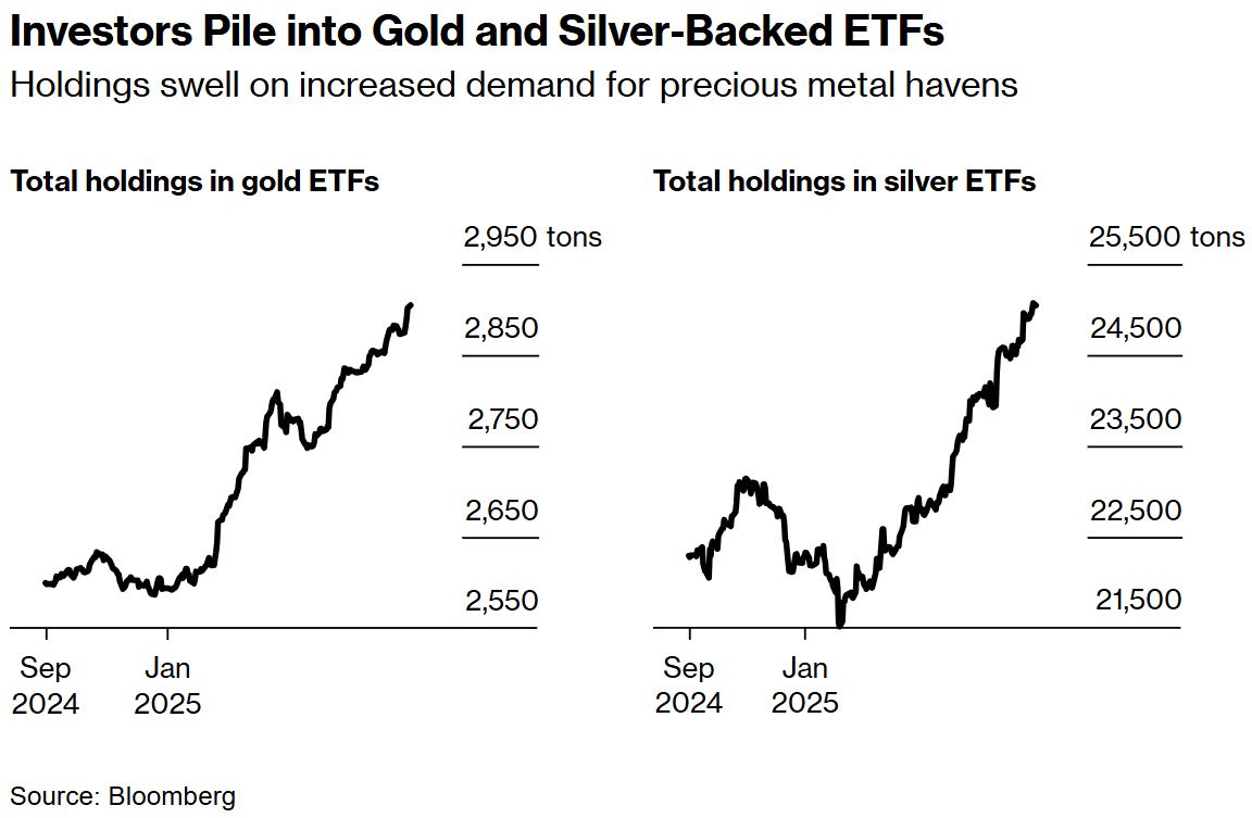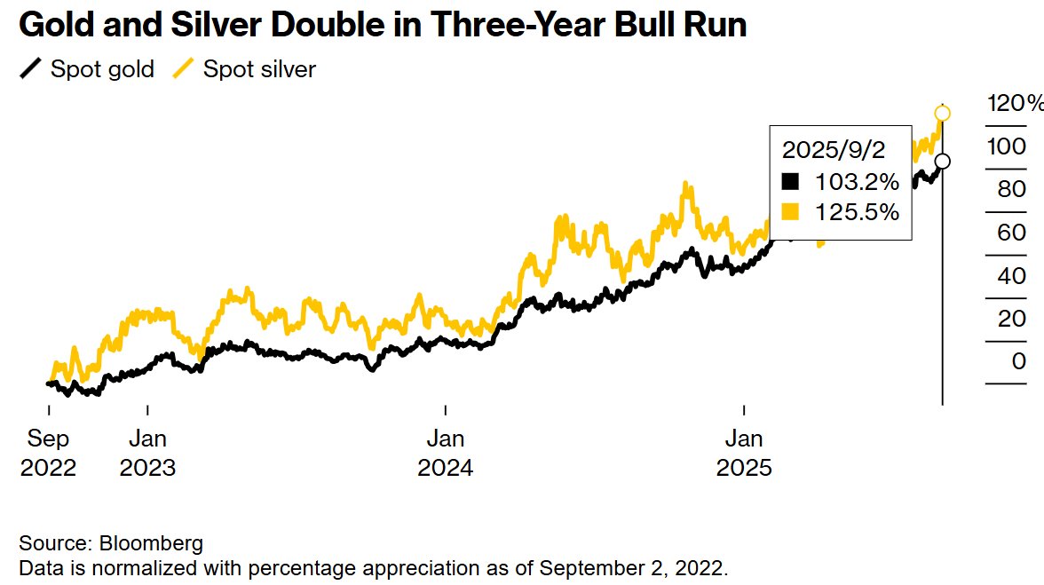 过去三年,黄金及其价格更低的“表亲”白银均上涨了一倍多,地缘政治、经济和全球贸易领域的风险不断上升,推动了人们对这些历史悠久的避险资产的需求增长。今年,特朗普对美联储的攻击升级,这已成为投资者担忧的最新原因,对美联储独立性的担忧可能削弱人们对美国的信心。