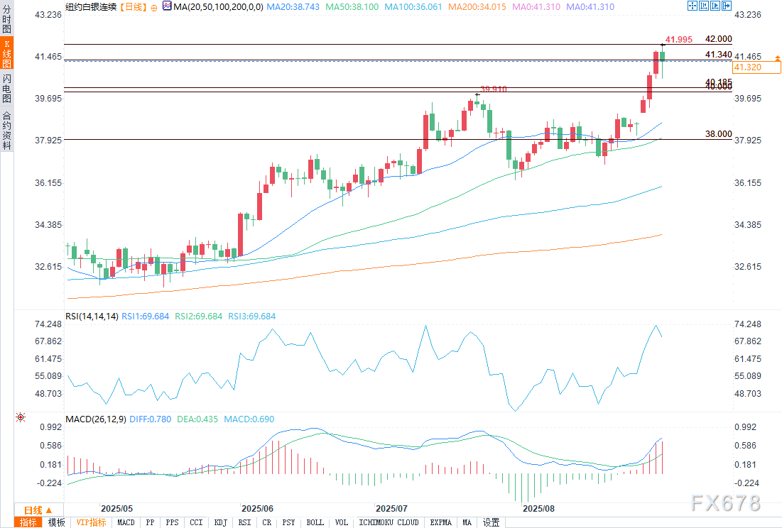 从技术面来看,9月白银期货多头在短期整体技术面同样占据稳固优势。白银多头的下一个上行目标是推动期货价格收于45.00美元的关键阻力位上方;空头的短期下行目标是将期货价格压至38.00美元的关键支撑位下方。第一阻力位为今日高点41.34美元,进一步阻力位为42.00美元;第一支撑位为隔夜低点40.185美元,进一步支撑位为40.00美元。