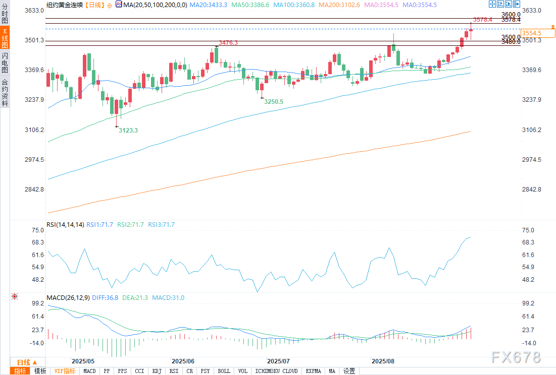 从技术面来看,12月黄金期货多头在短期整体技术面占据明显优势。多头的下一个上行目标是推动期货价格收于3600.00美元的关键阻力位上方;空头的短期下行目标则是将期货价格压至3400.00美元的关键技术支撑位下方。第一阻力位为今日高点3578.40美元,进一步阻力位为合约高点3585.80美元;第一支撑位为3500.00美元,进一步支撑位为3480.00美元。